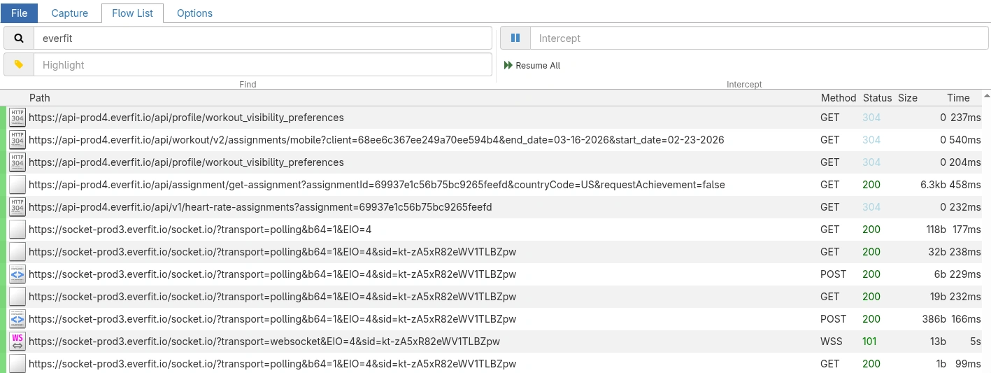 mitmproxy capturing the Everfit API request and response