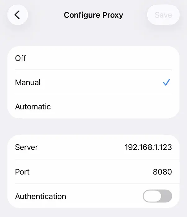 iOS Wi-Fi proxy settings pointed at the mitmproxy host Tap through some completed workouts on the phone to request the data from Everfit.